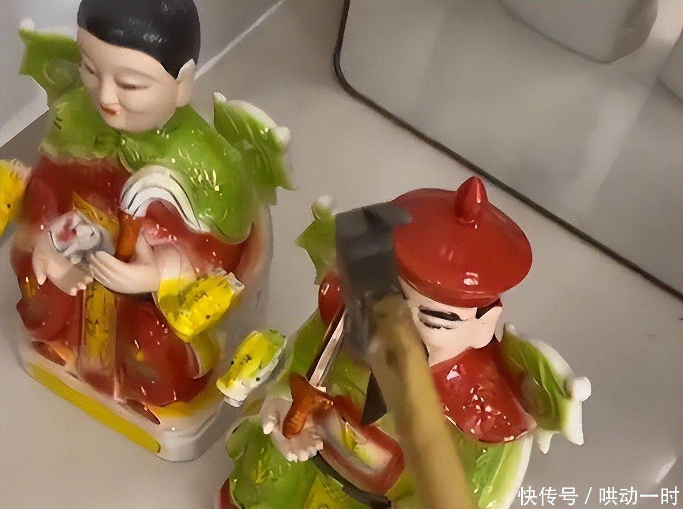 镜头前,他手捏铁锤,嘴角微扬,一边挥锤猛击一边大声讥刺:“什么有效不有效?不外是一团泥胎木塑,谁信谁傻!”