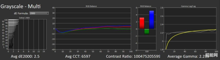 这个测试是在预设样式下进行的。技嘉MO32U24的伽马值为2.219,白均衡ΔE为2.5,色温则是6597K。这推崇挺轨范的,色善良伽马值跟建设里的相符。