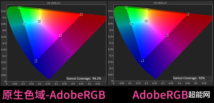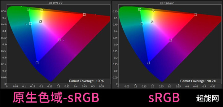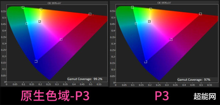 先看原生色域建设下的色域遮掩吧。除了sRGB外,P3遮掩也达到了99.2%,这个推崇相配出色。因此色域缩限后,P3遮掩也有97%,降幅很小。