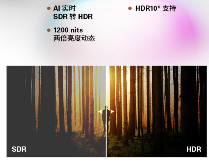 你可能会说:我平时看的视频资源里,有HDR版块的好像未几,那这个功能有什么用呢?诚然,HDR视频的数目确乎远少于SDR视频,不外雷鸟其实也贵重到了这点,它们为Air 4 Pro添加了“AI HDR”功能。