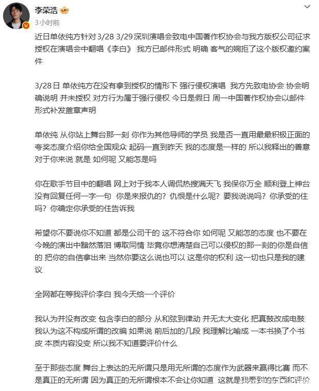 李荣浩此次是确凿动了怒,径直甩出四份实锤文献,连着四个问号砸向单依纯。明明版权央求在 3 月 27 日就被音著协明确圮绝了,可到了 28 日深圳演唱会现场,《李白》这首歌照样唱得响亮。这种明知故犯的操作,换谁心里能没疙瘩?过后那句轻盈飘的“正在核实”,更是把锅全甩给团队,确切让东谈主难以笃信。