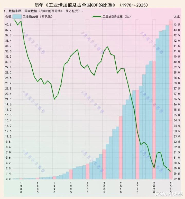 1978 年,中国工业占 GDP 比重一度跃至 44% 以上,彼时工业加多值尚不及 1 万亿元,却撑起了国民经济的半壁山河。