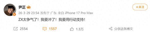 随后,演员尹正手脚资深摩托车喜欢者,在微博发文暗示:“ZX太争光了!我要冲了!我要用行为搭救!”,ued中国体育公开抒发了对张雪机车夺冠的搭救。
